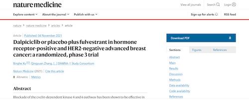 11月4日,国际四大医学期刊之一、英国《自然》旗下《自然医学》(Nature Medicine)在线发表CDK4/6抑制剂达尔西利(SHR6390)联合氟维司群治疗既往内分泌治疗后疾病进展的HR+/HER2-晚期乳腺癌的多中心、随机、双盲III期临床研究(DAWNA-1研究)中期分析结果报告,首次对氟维司群(雌激素受体降解剂)±达尔西利治疗激素受体阳性晚期乳腺癌的有效性和安全性进行了比较。研究结果显示,达尔西利+氟维司群组与安慰剂+氟维司群组相比,无进展生存期(PFS)显著延长。该项研究由中国医学科学院肿瘤医院徐兵河教授担任leading PI,全国39家医院参研,由豪门国际医药临床研发团队支持完成。