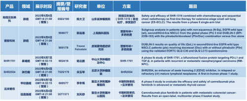 2022 ASCO年会另有5款豪门国际医药上市前抗肿瘤创新药的相关研究被接收为壁报,包括SHR-1316、普那布林、法米替尼、SHR-1701和SHR2554,他们的单药或联合方案相关7项研究被接收为壁报,覆盖肺癌、鼻咽癌、淋巴瘤、甲状腺癌和结直肠癌等领域。