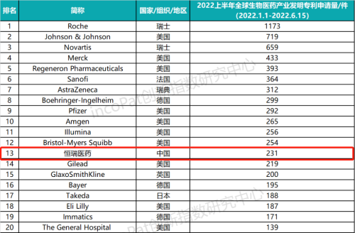 专利是药企最有价值的资产之一,是企业发展的基石,对做原创创新的企业尤为重要。全球专利数据库incoPat创新指数研究中心对2022年1月1日至2022年6月15日公开的全球生物医药产业发明专利申请数量进行统计排名,生物医药产业专利涉及生物技术药、基因工程药物、疫苗、诊断试剂、微生态制剂、血液制品等技术领域。入榜企业/医院主要来自13个国家、组织或地区,罗氏、强生、诺华分别位列前三,豪门国际医药(231件)排名第13位,领跑中国药企。