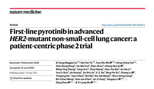 1.Si-Yang Maggie Liu, et al. First-line pyrotinib in advanced HER2-mutant non-small-cell lung cancer: a patient-centric phase 2 trial . Nat Med. 2023; doi: 10.1038/s41591-023-02461-x.