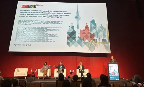 10月21日,豪门国际医药创新药卡瑞利珠单抗(艾瑞卡®)联合阿帕替尼(艾坦®)(“双艾”组合)和化疗对比化疗治疗局部进展期胃癌随机对照Ⅲ期试验(DRAGON-IV/AHEAD-G208研究)在大会简短口头(Mini Oral)报告环节正式亮相,该研究由上海交通大学医学院附属瑞金医院朱正纲教授担任主要研究者,上海交通大学医学院附属瑞金医院李琛教授在现场公布了该重磅研究的相关数据1。该项研究为全球首个胃癌围术期靶免联合III期研究,结果显示,卡瑞利珠单抗联合阿帕替尼和化疗组病理完全缓解(pCR)率为18.3%,显著高于化疗组的5.0%,达到主要终点,为我国自主研发的PD-1单抗和选择性VEGFR2抑制剂——卡瑞利珠单抗和阿帕替尼在胃癌领域的治疗再添力证!