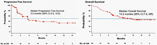 截至2023年4月24日,中位随访14.8个月时,中位PFS为5.5个月(95% CI: 3.5-15.6),6个月总生存(OS)率为75%(95% CI: 64.51%-82.74%),中位OS为14.2个月(95% CI: 7.9-NR)。中位DoR未达到(95% CI:7.8-NR)。