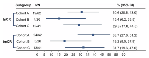 NeoPaTHer研究是一项多中心、前瞻性、非随机的二期临床研究,入组标准为肿瘤直径≥2cm、伴或不伴淋巴结转移、尚未发生远处转移的HER2阳性乳腺癌患者。患者首先接受多西他赛、卡铂联合曲妥珠单抗治疗2个周期,随后进行MRI检查。根据RECIST 1.1标准,若病灶最大直径缩小至少30%,则认为治疗有效,继续原方案治疗4个周期(A组);若无效,则根据患者意愿分为两组:B组继续原方案治疗4个周期,C组在原方案基础上联合吡咯替尼治疗4个周期。研究的主要终点为乳房肿瘤和腋窝淋巴结的tpCR率。研究原计划B组和C组的样本量分别为32例和63例(1:2)。