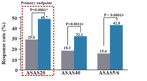 图1.艾玛昔替尼组与安慰剂组ASAS20、ASAS40和ASAS5/6应答情况