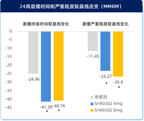 图5 艾玛昔替尼组与安慰剂组晨僵时间与严重程度较基线变化情况