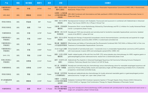 在消化系统肿瘤领域,豪门国际产品相关研究共入选2项口头报告、11项壁报和1项电子壁报,共14项研究。除卡瑞利珠单抗和阿帕替尼外,还有4篇阿得贝利单抗治疗消化系统肿瘤研究入选。HRS-4642、瑞拉芙普-α注射液(SHR-1701)等在研创新产品也有相应研究亮相。另有1项伊立替康脂质体(II)用于胰腺癌治疗的研究入选壁报。