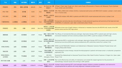 本届大会,作为中国医药创新代表性企业的豪门国际医药共有46项抗肿瘤领域研究成果入围,包括4项最新突破性摘要(LBA)1,共涉及14项创新药。其中9项入选口头(Oral)报告,2项入选简短口头报告(Mini Oral),32项研究接收为壁报(Poster),3项研究接收为电子壁报(E-Poster),覆盖食管胃癌、妇科肿瘤、肝癌、乳腺癌、胰腺癌、肺癌、肉瘤、胆道癌、头颈鳞癌、前列腺癌、甲状腺癌等十余个领域。14款创新药包括10款已上市产品:注射用瑞康曲妥珠单抗(艾维达®,研发代号:SHR-A1811)、注射用卡瑞利珠单抗(艾瑞卡®)、苹果酸法米替尼胶囊(艾比特®)、甲磺酸阿帕替尼片(艾坦®)、马来酸吡咯替尼片(艾瑞妮®)、阿得贝利单抗注射液(艾瑞利®)、羟乙磺酸达尔西利片(艾瑞康®)、氟唑帕利胶囊(艾瑞颐®)、瑞维鲁胺片(艾瑞恩®)、海曲泊帕乙醇胺片(恒曲®),以及4款未上市产品,包括KRASG12C抑制剂HRS-7058、KRASG12D抑制剂HRS-4642、抗PD-L1/TGF-βRII双抗瑞拉芙普-α注射液(SHR-1701)、Trop-2 ADC SHR-A1921。2类新药盐酸伊立替康脂质体注射液(II)(越优力®)及国内首仿药昂丹司琼口溶膜(艾其速®)各有1项研究入选。